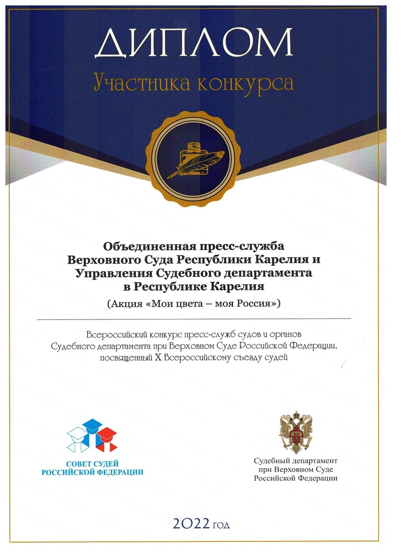 Объединенная пресс-служба Верховного Суда Республики Карелия и Управления Судебного департамента в Республике Карелия удостоена дипломов Всероссийского конкурса пресс-служб судов и