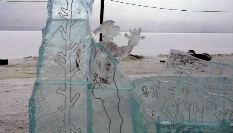На набережной уже стоят несколько готовых ледовых фигур – их сделали участники проекта «Школа скульпторов 60 Параллель». Также есть очень симпатичная фотозона – ледяные глыбы с рисунками, напоминающими петроглифы.