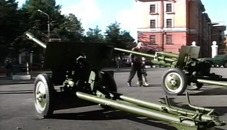 У Дома офицеров ровно двадцать лет назад состоялось открытие второй очереди выставки военной техники (мы рассказывали, с чего все начиналось – можете взглянуть вот здесь). Ко Дню города там появился БТР и гусеничный тягач, а спустя пару месяцев собравшиеся увидели перед зданием еще две настоящие пушки.