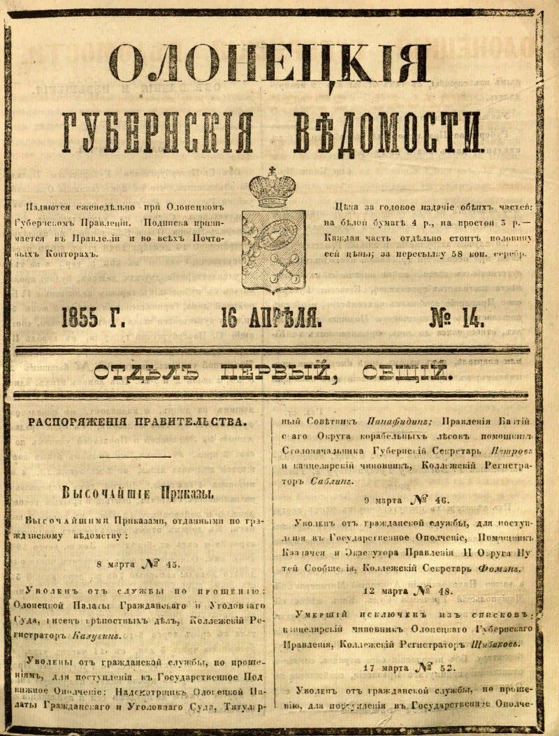 8 января 1838 года вышел первый номер газеты «Олонецкие губернские ведомости».