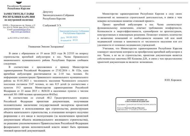 На днях депутат ЗС РК Эмилия Слабунова на своей странице в соцсетях разместила ответ вице-премьера Игоря Корсакова на ранее направленный запрос. Корсаков сообщил, что проект строящейся в поселке Чална амбулатории соответствует требованиям, просто Минздрав РК неверно истолковал понятие «типовой проект». А представить проект депутату не могут, так как он является собственностью заказчика, ИП Казакова Д.В.