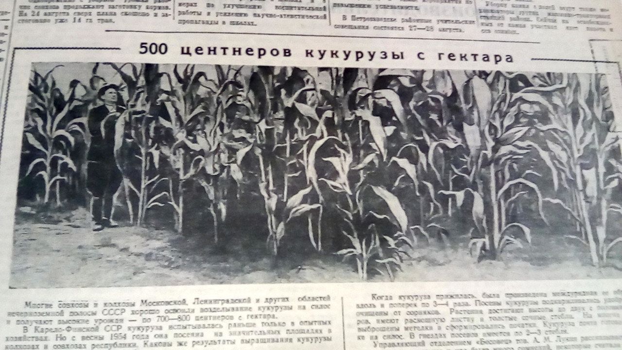 Газета «Ленинское знамя», заметка от 11 декабря 1954. Плоды упорного труда: «До нынешнего года на силос у нас шли, в основном, отходы растениеводства, лишь частично сеяли для этого горохо-овсяную смесь. Весной этого года мы впервые применили возделывание кукурузы. Под кукурузу было отведено 6, 5 гектара земли. Кукурузу посадили на картофельных участках, заправленных органическими удобрениями из расчета 15 тонн на гектар. Поля были вспаханы на зябь. Посадку мы проводили 16-20 июня ручным способом. Лунки делали мотыгами. После посадки мы взрыхлили землю конными ежами. Уход за кукурузой заключался в ряде рыхлений и подкормок минеральными удобрениями. В некоторых местах, где растения развивались слабо, мы добавили подкормку навозной жижей. Уборку мы начали 9 сентября. Початки к тому времени достигли молочной спелости. Высота отдельных растений достигала 3 метров. На растениях было по 3-4 початка. Опыт показал, что в нашей республике есть все условия для выращивания кукурузы на силос. Л. Зыкина, главный агроном совхоза имени Зайцева».