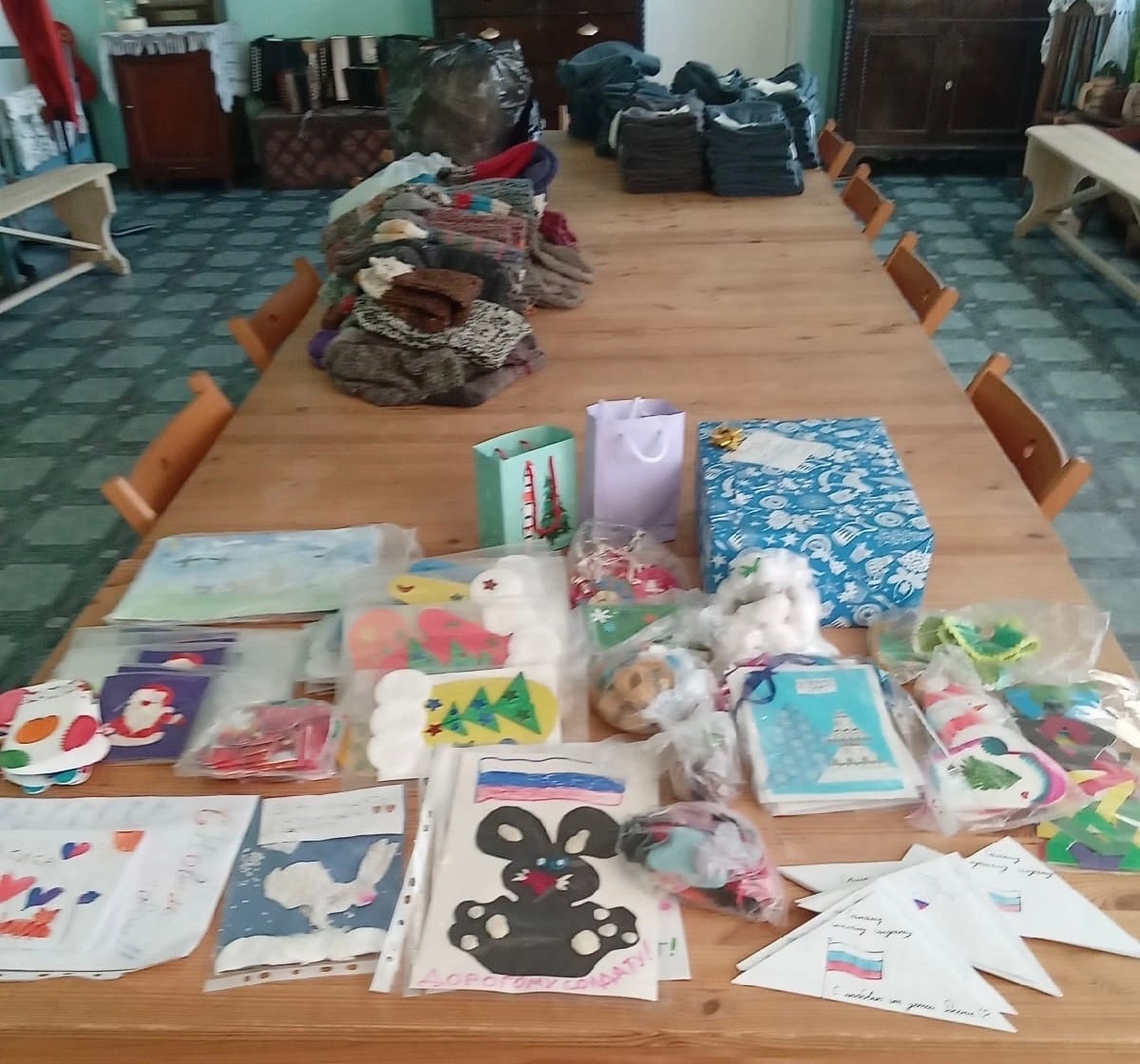 Военнослужащим привезли новогодние подарки, теплые вещи, медикаменты, а также письма и сувениры от детей из Святоозеро, Эссойлы, Чалны и Пряжи. Для них также подготовили концертную программу и видеоролик с новогодними поздравлениями от близких и родных.