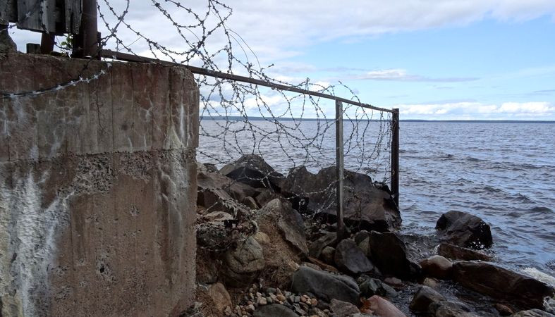 Те, кто любит гулять в Сайнаволоке в Петрозаводске, наверняка видели в районе мыса Сальнов ограду, перекрывающую проход по берегу Онежского озера. Летом 2022 года журналисты нашего издания тоже столкнулись с удивительной картиной: береговая полоса в районе мыса с одной стороны была перегорожена забором, переходящим в металлическую ограду с колючей проволокой, а с другой стороны вдоль озера тянулась деревянная ограда, завершающаяся булыжниками и колючей проволокой.
