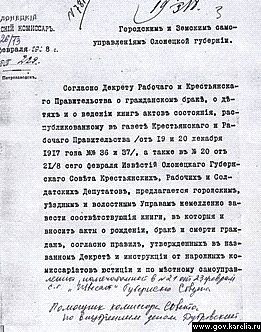 Март 1918 года начал функционировать городской местный отдел ЗАГС при Петрозаводском горсовете.