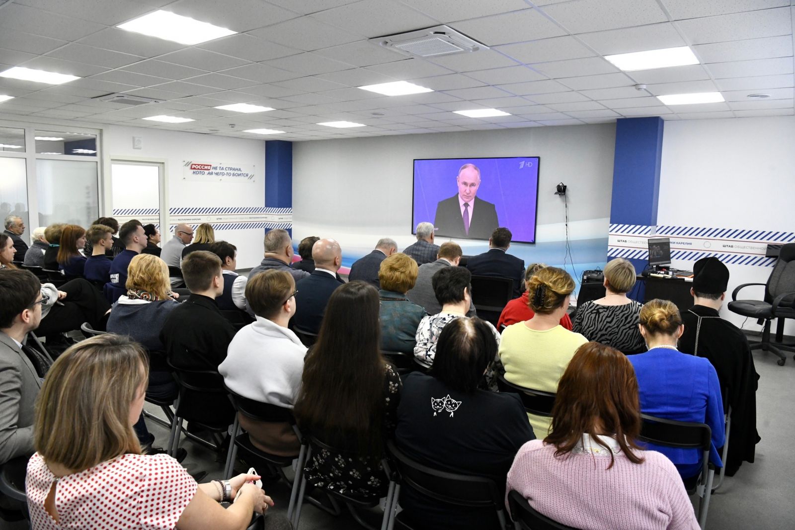 29 февраля в Штабе общественной поддержки Карелии в Петрозаводске собрались представители НКО, молодежных движений, парламентских партий, религиозных и национальных организаций для совместного просмотра и обсуждения послания Федеральному собранию. Всего в конференц-зале присутствовало порядка 80 человек.