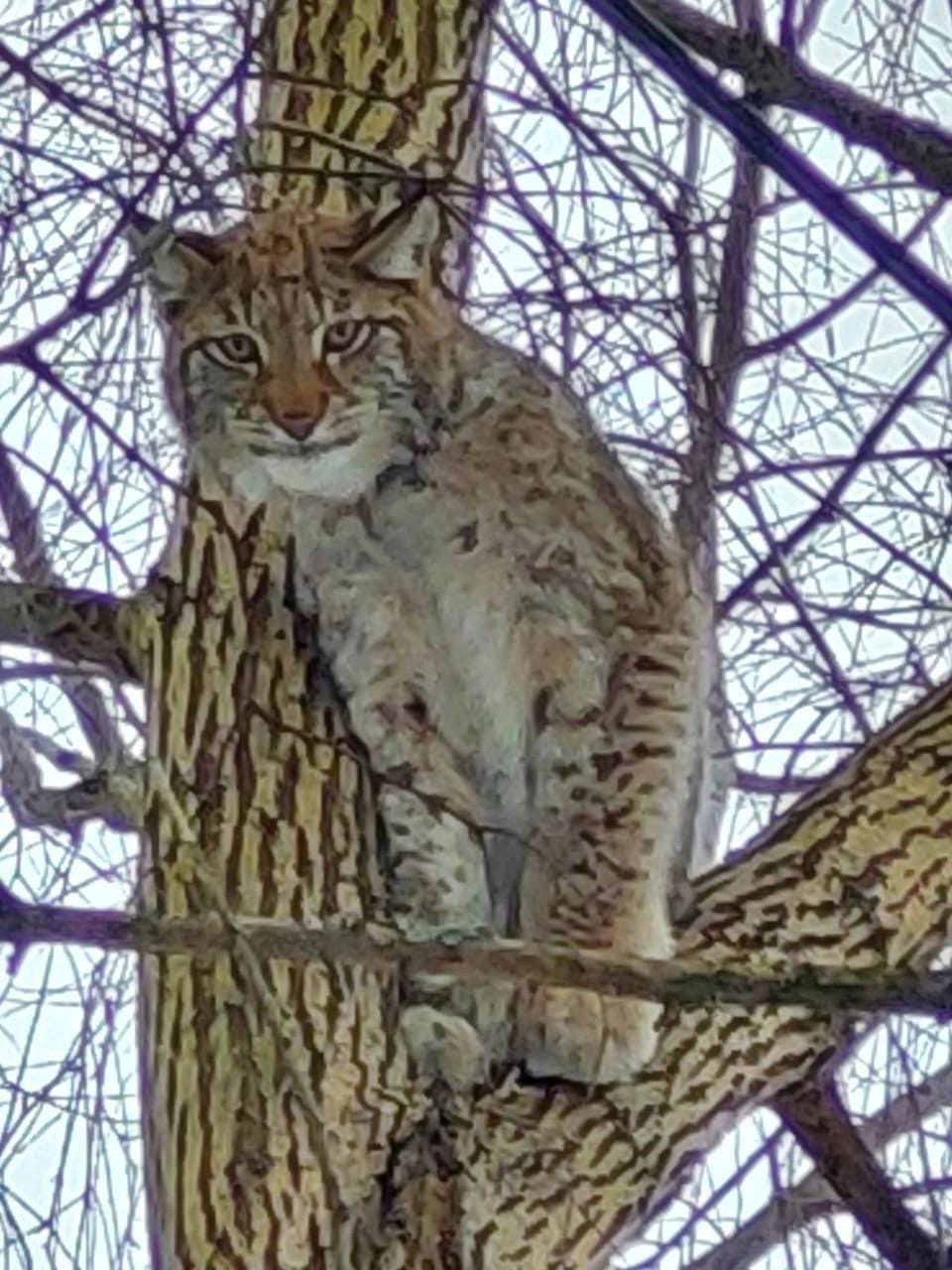 Сегодня к жителям Пудожа из леса вышла рысь. Дикое животное забралось на дерево рядом с лесхозом. Видео, на котором запечатлена лесная хищница, разместила у себя на странице Ирина Ригина.