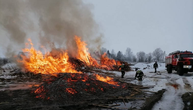 Когда сотрудники ПЧ-35 Олонца прибыли на место происшествия, штабеля горбыля были уже охвачены огнем. Пожар тушили семь человек личного состава.