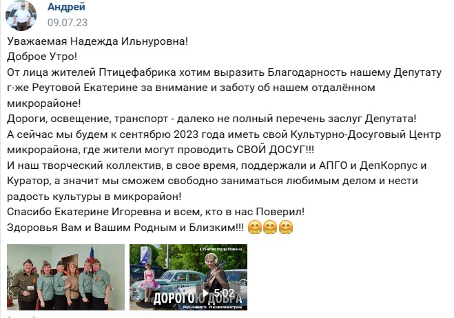 «От лица жителей Птицефабрика хотим выразить благодарность нашему депутату Реутовой Екатерине за внимание и заботу о нашем отдалённом микрорайоне! Дороги, освещение, транспорт - далеко не полный перечень заслуг депутата. А сейчас мы будем к сентябрю 2023 года иметь свой Культурно-Досуговый Центр микрорайона, где жители могут проводить СВОЙ ДОСУГ!!! И наш творческий коллектив, в свое время, поддержали и АПГО, и ДепКорпус, и куратор района, а значит, мы сможем свободно заниматься любимым делом и нести радость культуры в микрорайоне. Спасибо Екатерине Игоревне и всем, кто в нас поверил. Здоровья Вам и Вашим родным и близким»,- говорится в сообщении.
