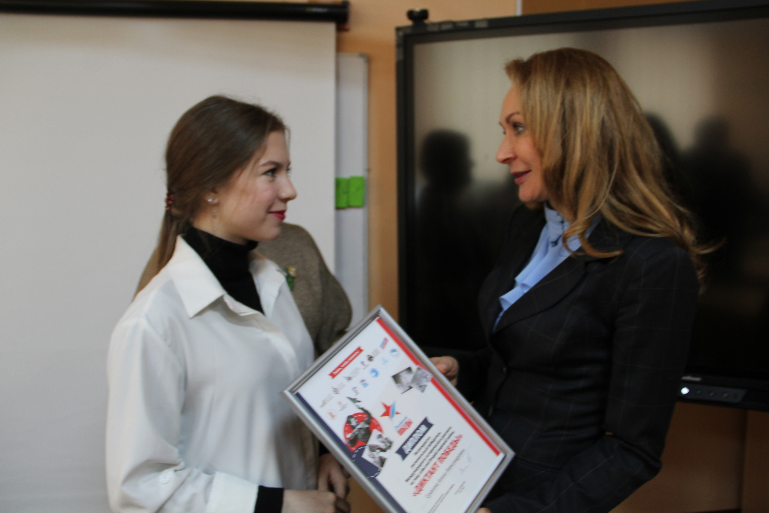 Председатель Петрозаводского городского Совета Надежда Дрейзис поздравила ученицу 11 «А» класса средней школы №8 им. Н.Г.Варламова Алину Суханову от Карельского регионального отделения партии «Единая Россия» и вручила ей высокую награду.