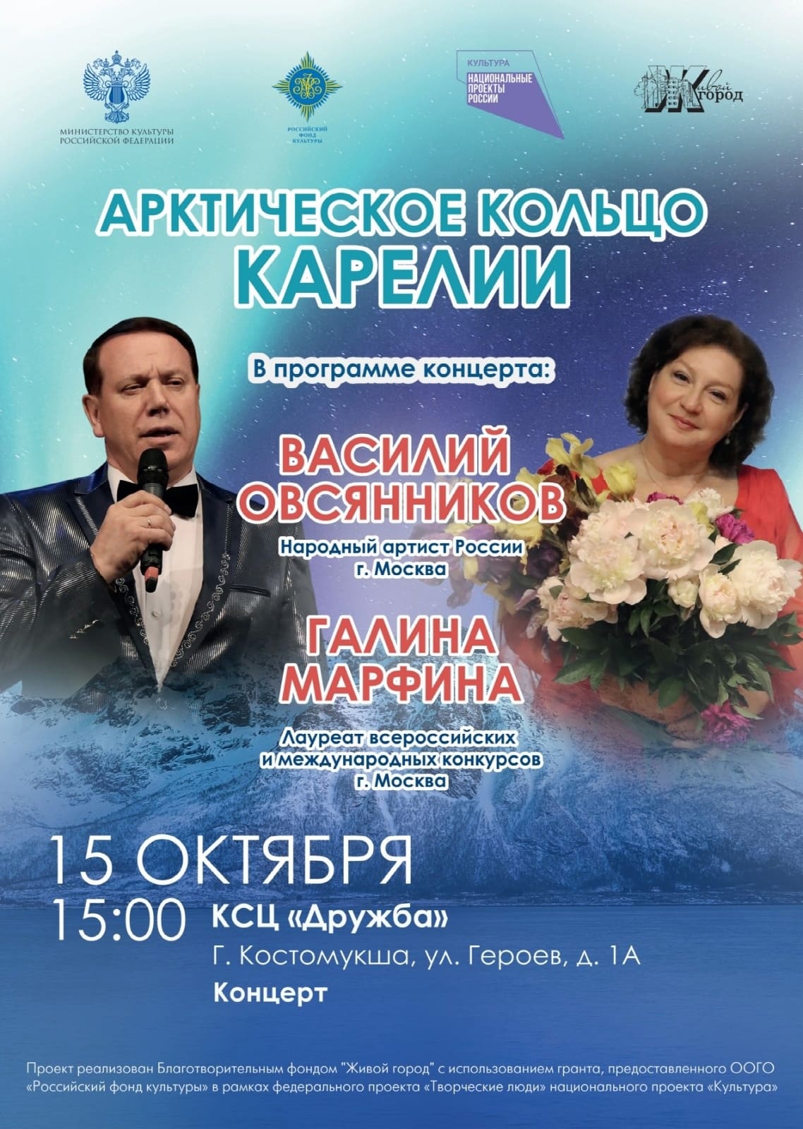 Бесплатный концерт с участием местных коллективов, а также народного артиста России Василия Овсянникова и лауреата международных конкурсов Галины Марфиной состоится 15 октября в Культурно-спортивном центре «Дружба» в рамках творческого проекта «Арктическое кольцо Карелии» (6+).