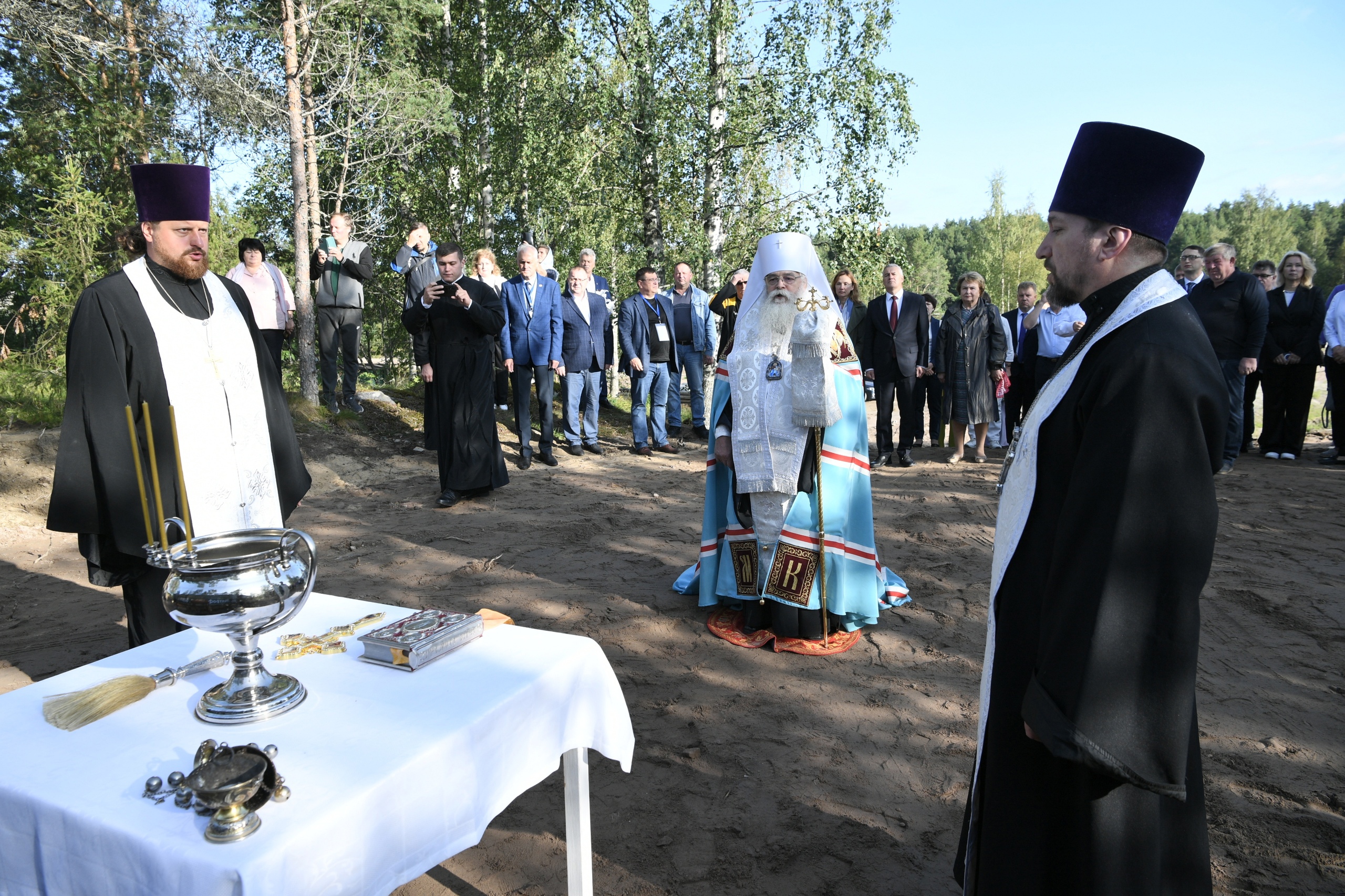 Сегодня в устье реки Койриноя глава Карелии заложил часовню в честь святого Митрофана Воронежского. Строительную площадку освятил митрополит Константин. На месте провели молебен. С закладки часовни началась праздничная программа Дня Карелии.
