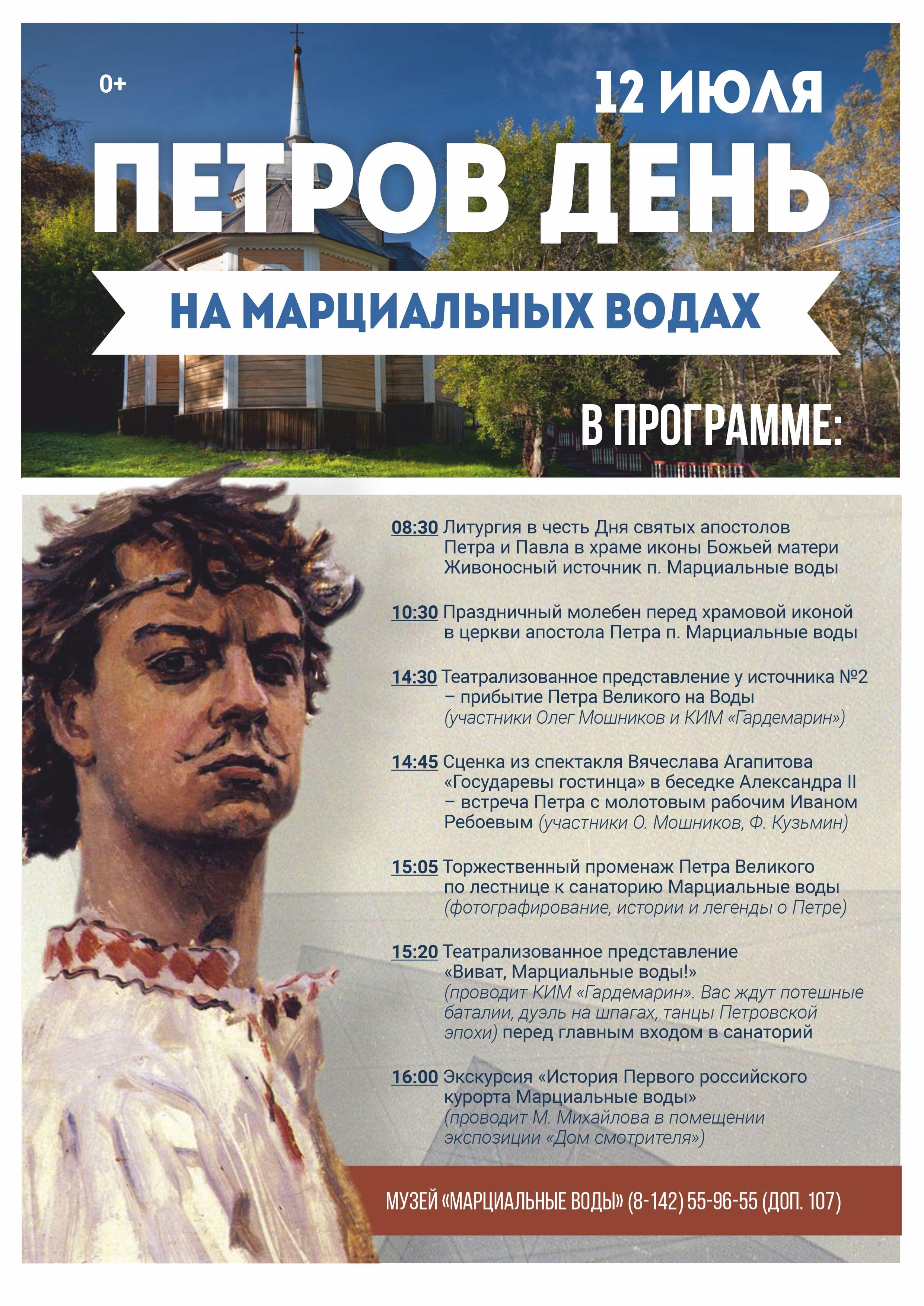 Затем в 14:30 у источника №2 начнется театрализованное представление о прибытии Петра Великого на Воды. Сразу же после этого у беседки Александра II разыграют сценку из спектакля Вячеслава Агапитова «Государевы гостинцы» – встреча Петра I с молотовым рабочим Иваном Ребоевым.