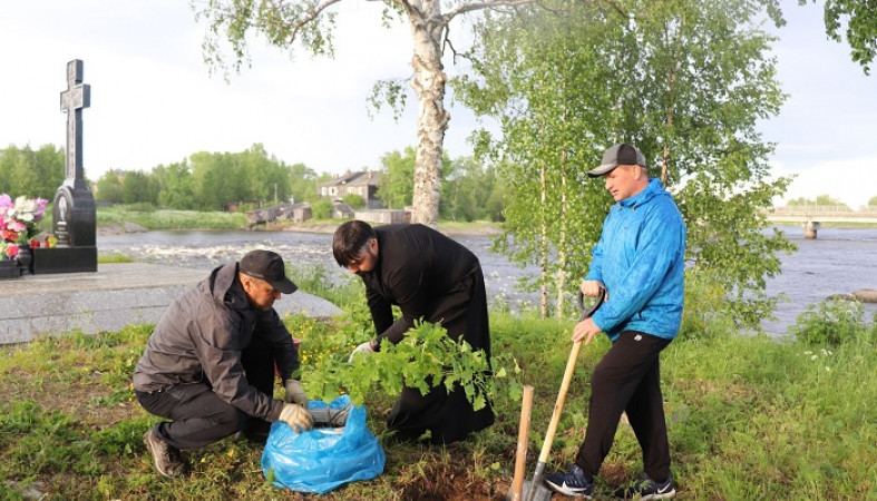 13 июня здесь высадили саженцы дуба, куст и цветы. Зеленые насаждения привезли в Карелию из питомника дубков в Новом Петергофе.