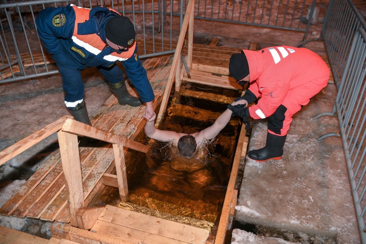 В этом году крещенские купания проходят в Петрозаводске впервые за несколько лет. Около памятника Петру I была организована купель глубиной 150 см с поручнями. Купания прошли под наблюдением сотрудников МЧС, полиции и казаков. Принять участие в обряде пришли сотни человек. Выстроилась очередь.