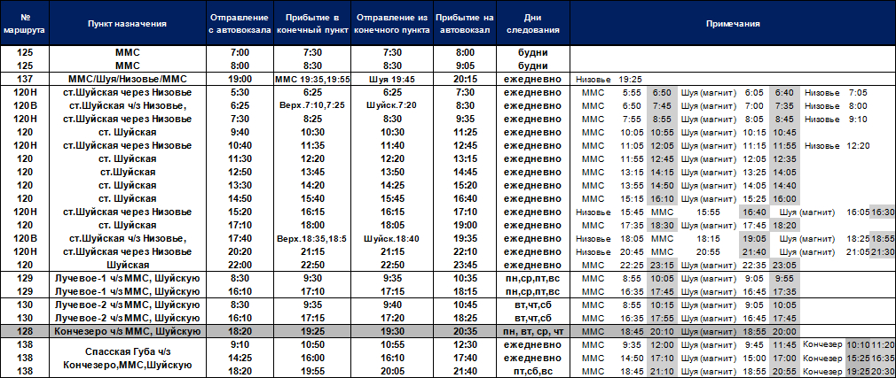 Обновленное расписание рейсов маршрута № 123 «Петрозаводск — Святозеро» и Шуйского направления представлено на фото.