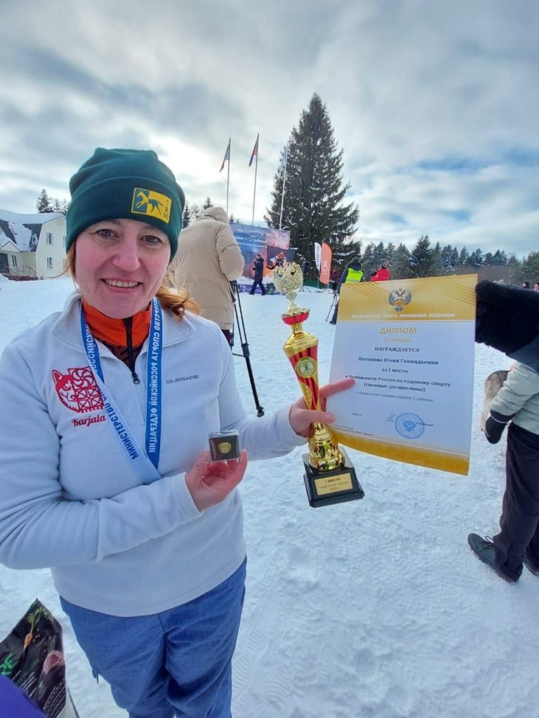 Юлия Потапова заняла 1 место на Чемпионате России по ездовому спорту (снежные дисциплины) в дисциплине «нарта-спринт 2 собаки»,
