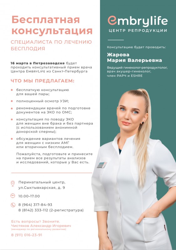 16 марта 2023 года на базе РПЦ (ул.Сыктывкарская 9) состоится консультативный прием по лечению бесплодия врача-репродуктолога клиники «ЦИЭР « ЭмбриЛайф» Жаровой Марии Валерьевны.
