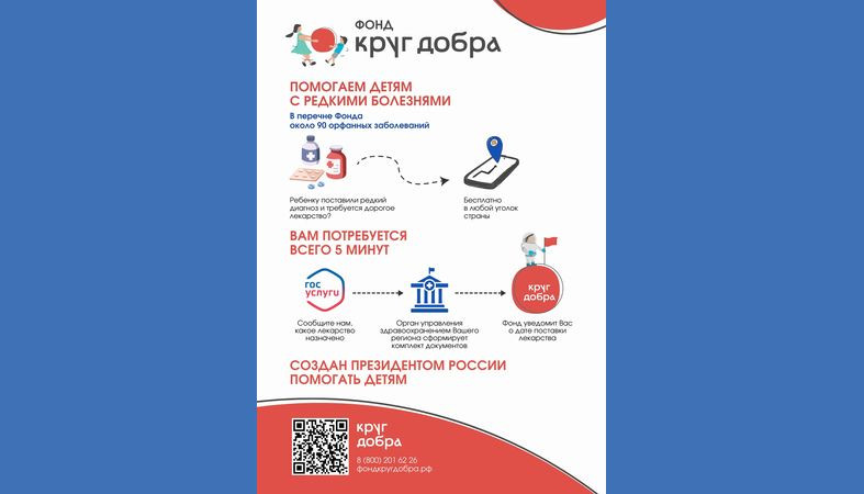 Фонд поддержки детей с тяжелыми жизнеугрожающими и хроническими заболеваниями «Круг добра» подготовил листок для размещения на информационных стендах и в соцсетях. Информлисток создан с целью повышения информированности родителей и детских врачей о возможности получения дорогостоящих лекарственных препаратов, медицинских изделий и технических средств реабилитации.