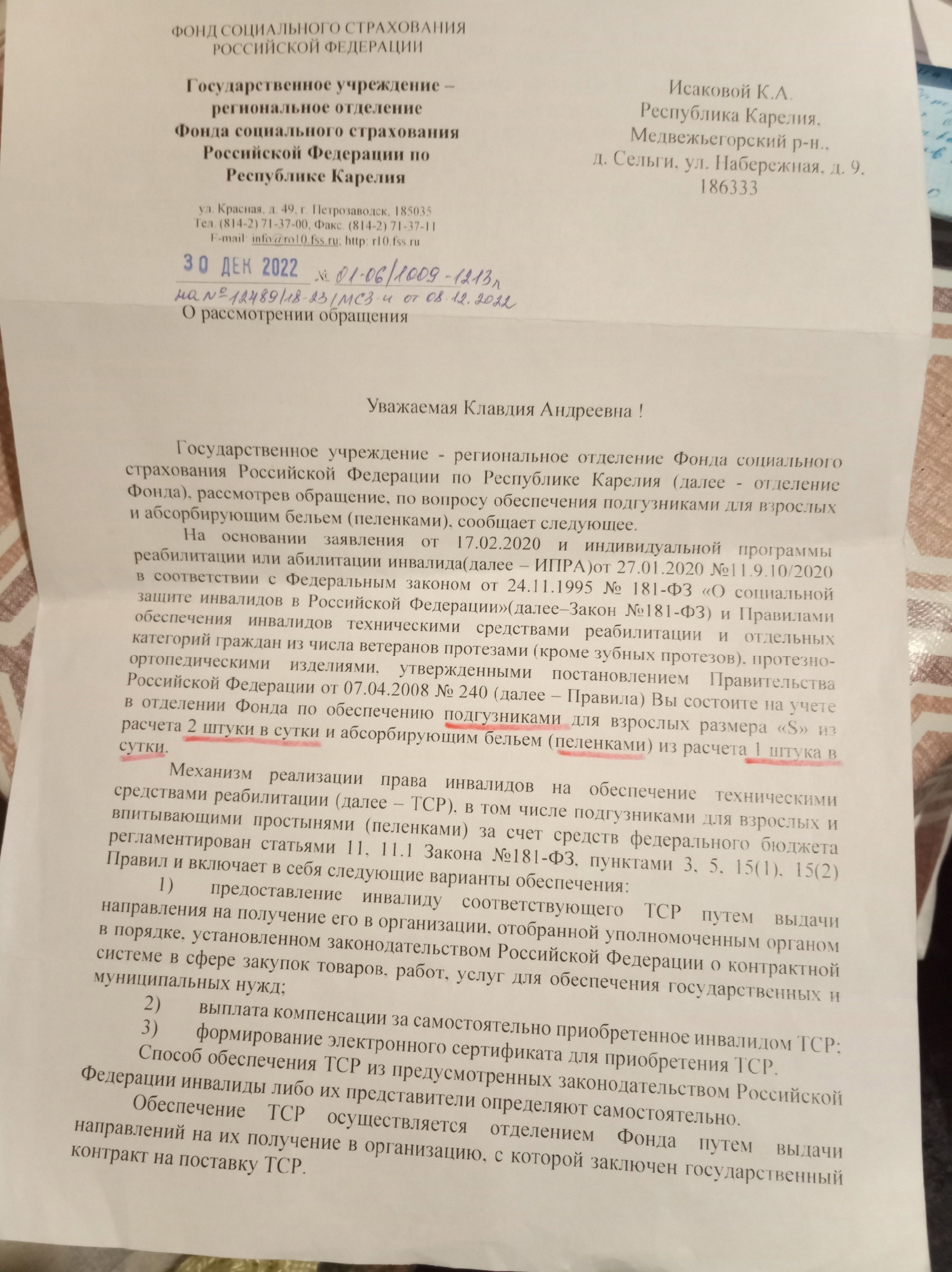 По словам женщины, ее мама получила ответ от Фонда социального страхования по Республике Карелия, где указано, что инвалид была обеспечена подгузниками только с 7 июня по 25 декабря, а пеленками не обеспечена вовсе. При этом в ведомстве не скрывают: задним числом технические средства реабилитации не выдаются.