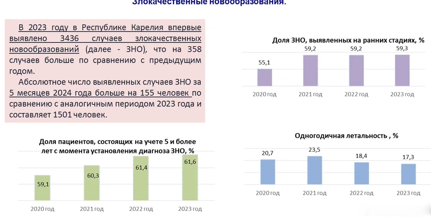 Скриншот трансляции заседания Правительства КарелииСкриншот трансляции заседания Правительства КарелииСкриншот трансляции заседания Правительства КарелииВ 2020 году в Карелии от злокачественных новообразований умерло 412 человек, в 2023 – 344 человека.