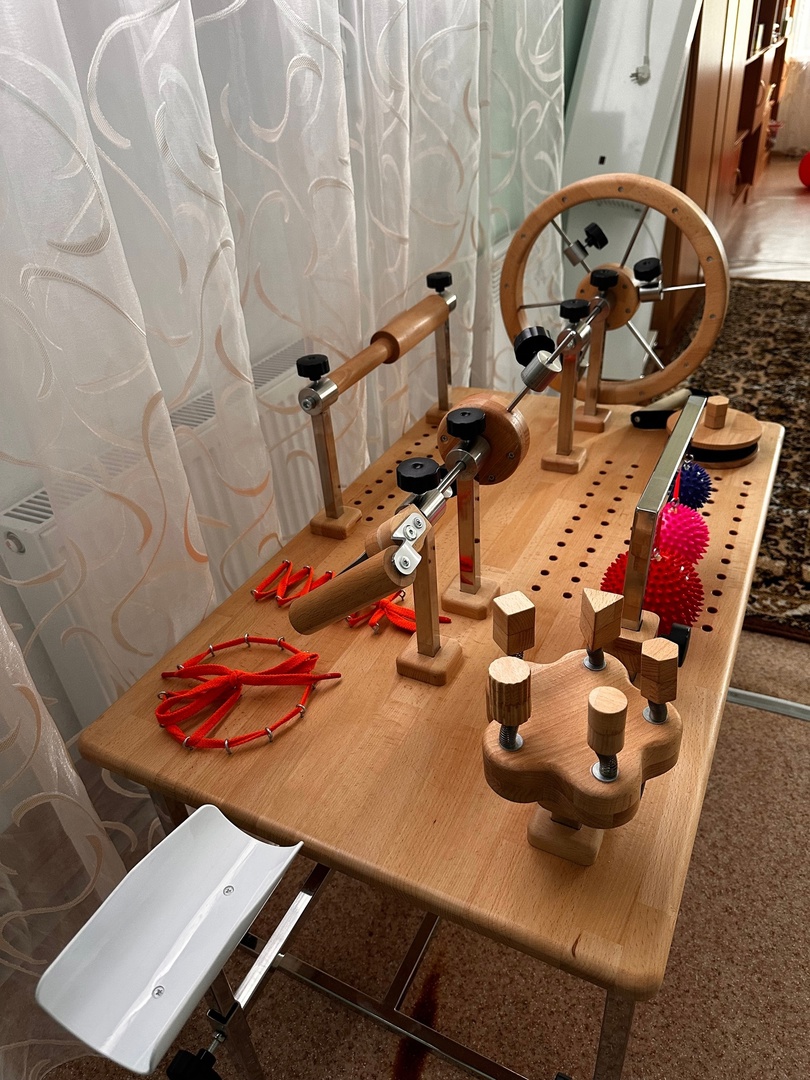 С помощью стола с размещенными на столешнице различными тренажерами инструктор по адаптивной физической культуре используя механотерапию, развивает силу мышц рук и мелкую моторику.