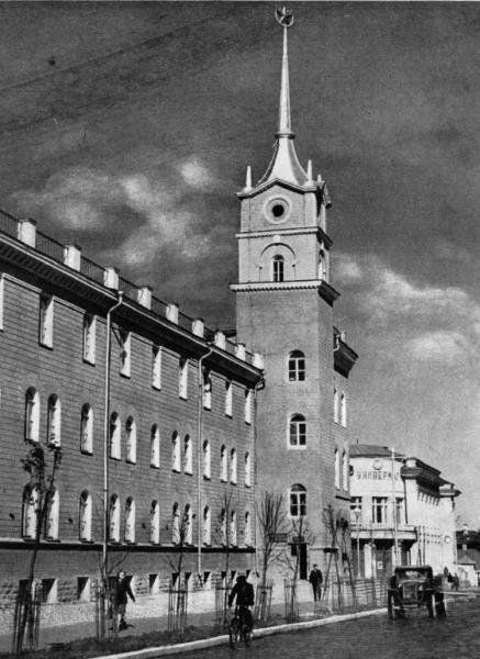 Фото: Возведение башни городского Дома связи. Дом связи был не только восстановлен, его центральная башня была украшена курантами и увенчана шпилем. 1947.