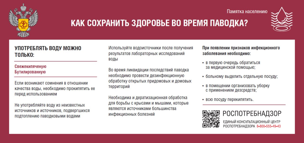 Роспотребнадзор призывает соблюдать правила профилактики во время весеннего паводка и половодья Из-за подтоплений возрастает риск загрязнения источников водоснабжения, что может вызвать: ➡️дизентерию;