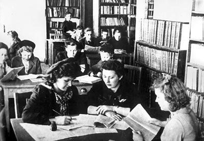Фото: В читальном зале библиотеки, 1945. Колонна университета следует на парад Победы, 1945. Студенты в геологическом музее ПГУ, 1948. Студенты у входа в ПГУ, 1949.