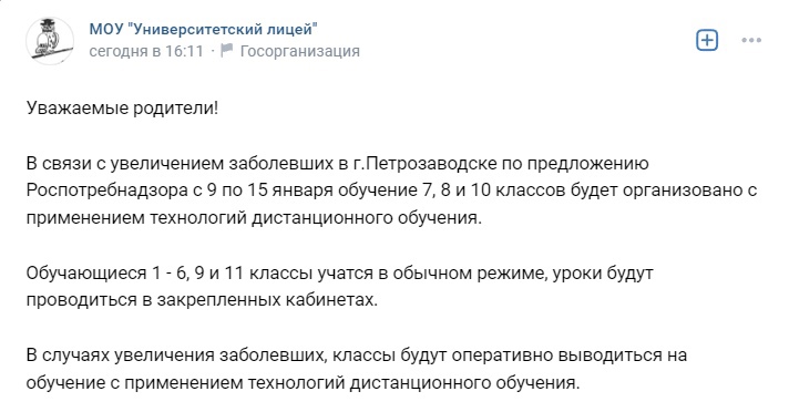 Не все классы петрозаводских школ завтра начнут учебу в очном режиме. Вчера учителя в срочном порядке собирали с родителей учеников информацию по заболевшим детям, и сегодня вечером в пабликах некоторых учебных заведений города появилась информация о том, что частично школы отправлены на дистант.
