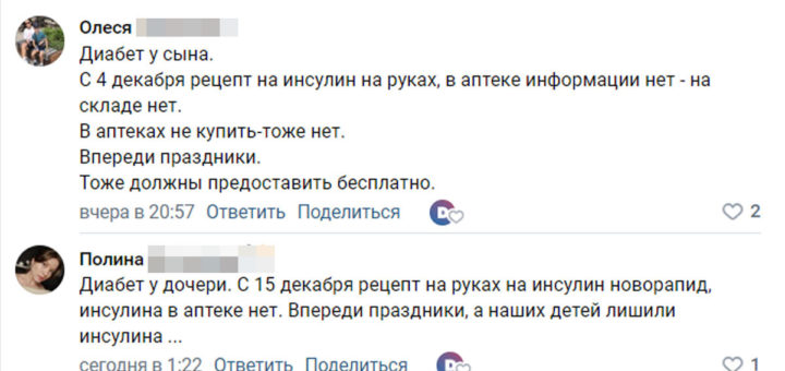 — Диабет у сына. С 4 декабря рецепт на инсулин на руках, в аптеке информации нет — на складе нет. В аптеках не купить – тоже нет. Впереди праздники. Должны предоставить бесплатно, — написала Олеся, в комментариях в социальной сети «ВКонтакте».