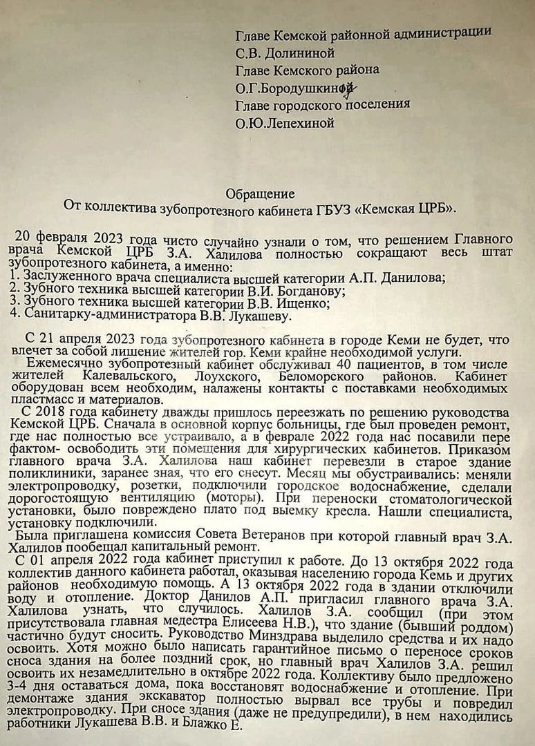 Опытные медики, которые работали в нем, – заслуженные врач и два техника, а также санитарка – написали письмо руководству района, города и Кемской больнице. Письмо опубликовано в паблике «Подслушано. Кемь» . В нем работники рассказали о своих скитаниях и проблемах. С их слов, с 2018 года кабинету дважды пришлось переезжать по решению руководства Кемской ЦРБ. Сначала в основной корпус больницы, где был проведен ремонт. В феврале 2022 года протезистов поставили перед фактом: освободить эти помещения для хирургических кабинетов. Кабинет перевезли в старое здание поликлиники, которое готовилось под снос. Месяц медики потратили, чтобы обустроиться в этом здании, поменять электропроводку, вентиляцию, подключить водоснабжение.