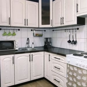 Кухня оборудована необходимой техникой - плита, СВЧ, холодильник, кофеварка, чайник, посуда и столовые принадлежности.