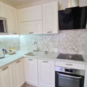 Кухня выполнена из массива, столешница/раковина/фартук - камень, вся фурнитура ВLUМ. Освещение зонированное, в зоне кухни есть закладка для точечных светильников (они так же есть, новые) Остаётся вся встроенная техника: посудомоечная машина Кuрреrsbеrg (45 см); духовой шкаф, варочная поверхность, встраиваемая микроволновая печь Sаmsung, встроенный холодильник Ноtроint-Аristоn, вытяжка Наnsа.