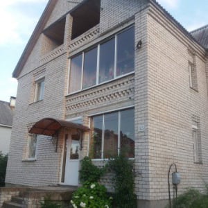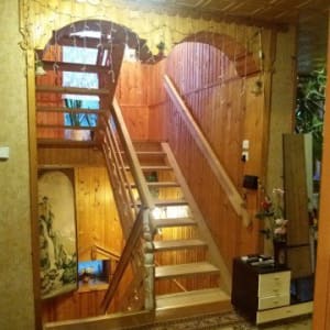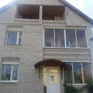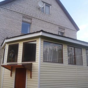 К дому пристроена большая веранда с выходом на 1 этаж и в сад. Материал стен-брус. Обшита -сайдинг.